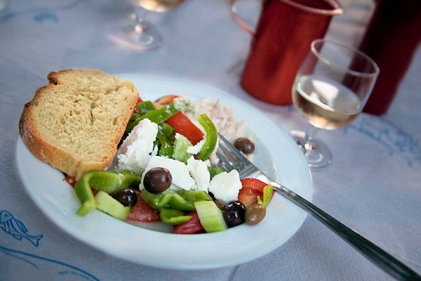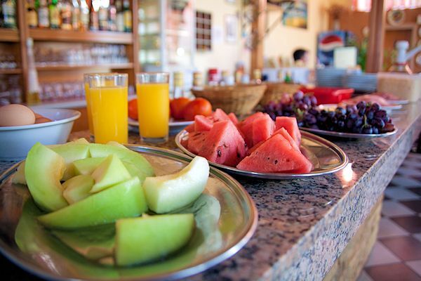 Halbpension. Griechisches Frühstücksbuffet (mit viel Obst, Käse, Wurst,