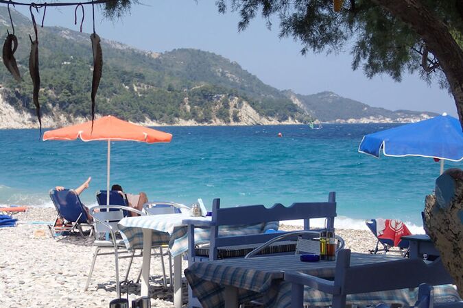 sehr grünen Bergumgebung, dem süßen Örtchen Kokkari. Vormittags ist oft der