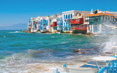 Südöstlich von Athen liegen die Kykladen als Gruppe von 23 größeren und 200 kleineren ringförmigen angeordneten, gebirgigen Inseln.