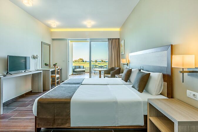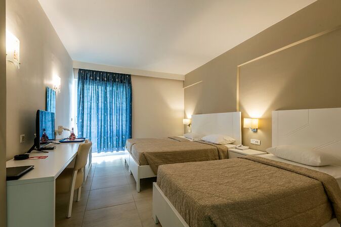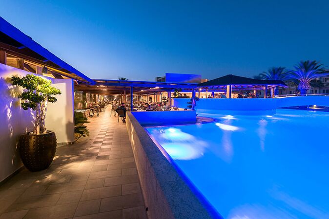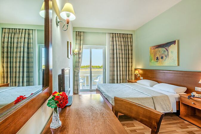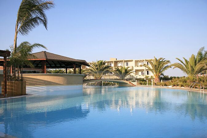 Das Hotel verfügt über 239 Zimmer, verteilt auf Haupthaus und mehreren Bungalows, Empfangshalle mit Rezeption, SAT-TV-Raum, WLAN (in den öffentlichen Bereichen inklusive), Restaurant mit Terrasse, italienisches Restaurant, griechische Taverne (Getränke nicht inklusive), Bar, Minimarkt, Boutique und Juwelier. Gartenanlage mit 2 Swimmingpools und Poolbars. Liegen und Schirme am Pool und Strand inklusive.