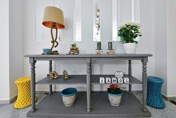 Dorfstraße vom Kiesstrand getrennt. Das kleine, stilvoll eingerichtete