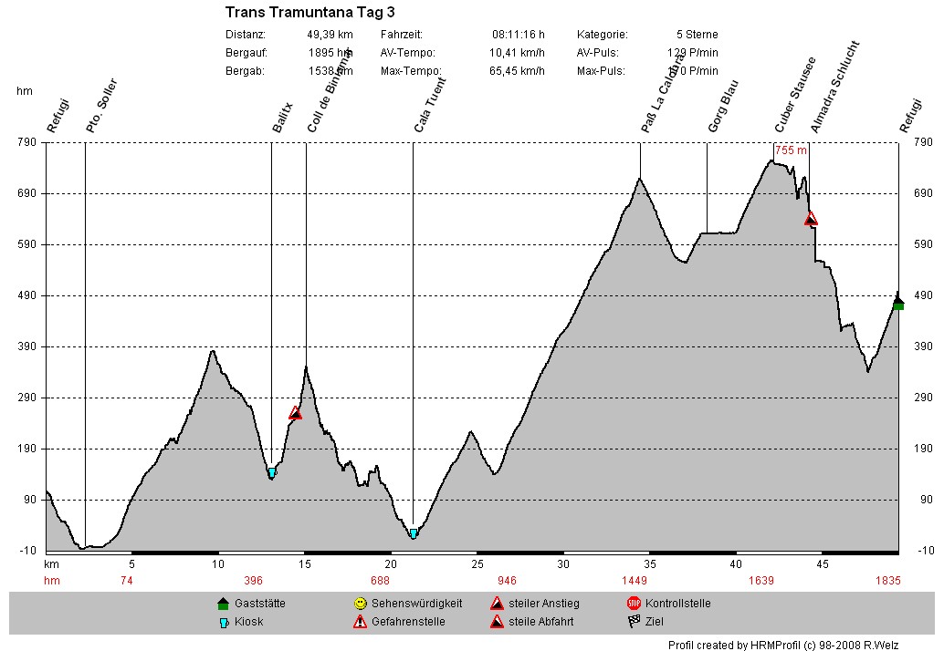 Je nach Route und Wetterbedingungen müssen 240 bis 300 km und 6.000 bis 7.900 hm bezwungen werden. Ein Gemisch von Asphalt, Off- Road, Singletrails und Trageabschnitten fordert viel von den Fahrern. Die Natureindrücke sind überwältigend und machen die Route zu einem wirklichen Erlebnis, der Abenteuerfaktor inklusive. Wir übernachten in gemütlichen Hostals und Hotels, auf Fincas und Berghütten sowie im Kloster Lluc. Am fünften Tag erreichen wir, nach einer letzten und harten Etappe unser Ziel Alcudia.