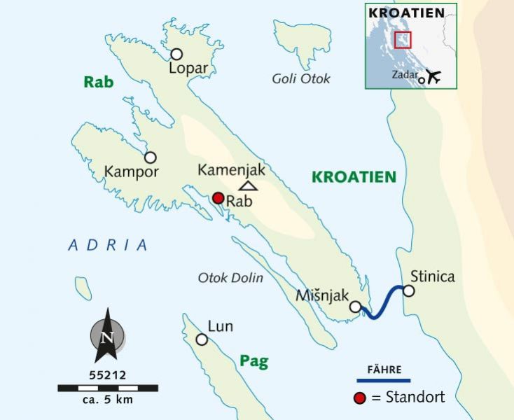 Flug nach Zadar und Transfer zum Fährhafen Stinica (ca. 2 1/2 Std.). Kurze Fährüberfahrt nach Mišnjak und Weiterfahrt zu unserem Hotel in Rab-Stadt.